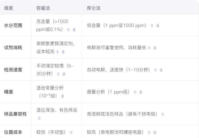 卡爾費(fèi)休水分測(cè)定儀(容量法)與庫(kù)倫法水分測(cè)定儀的核心區(qū)別主要體現(xiàn)在原理、適用范圍、操作方式及性能指標(biāo)上,具體分析如下: